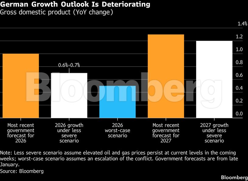 Οι εκτιμήσεις αποτυπώνουν τη διευρυνόμενη ζημία στη μεγαλύτερη οικονομία της Ευρώπης, λόγω των διαταραχών στον ενεργειακό εφοδιασμό που προκάλεσε ο πόλεμος μετά την επίθεση του προέδρου των ΗΠΑ Ντόναλντ Τραμπ στο Ιράν.