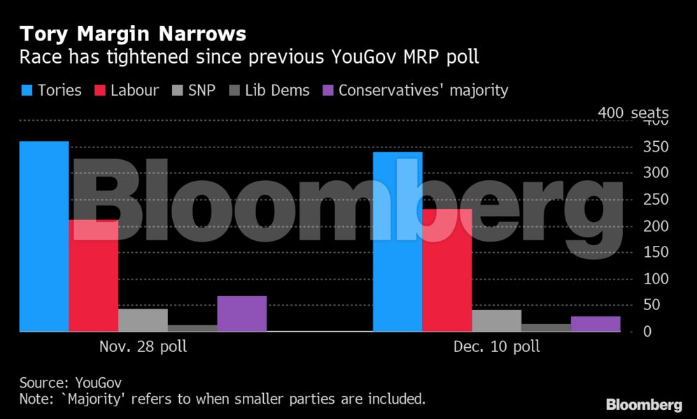 Η έρευνα της YouGov χρησιμοποιεί μια τεχνική μετρήσεων, η οποία της επέτρεψε να προβλέψει κοντύτερα από κάθε άλλον τα εκλογικά αποτελέσματα του 2017 στη χώρα. Τώρα υποστηρίζει ότι αν συμπεριληφθούν τα μικρότερα κόμματα στο Κοινοβούλιο, τότε οι Συντηρητικοί προβλέπεται να έχουν μια πλειοψηφία 28 εδρών. Αυτή η πρόβλεψη ελαττώνει το προβάδισμα Τζόνσον, σε σύγκριση με την προηγούμενη της ίδιας εταιρείας, που έγινε πριν από περίπου δυο εβδομάδες κι έδινε στους Συντηρητικούς προβάδισμα 68 εδρών.