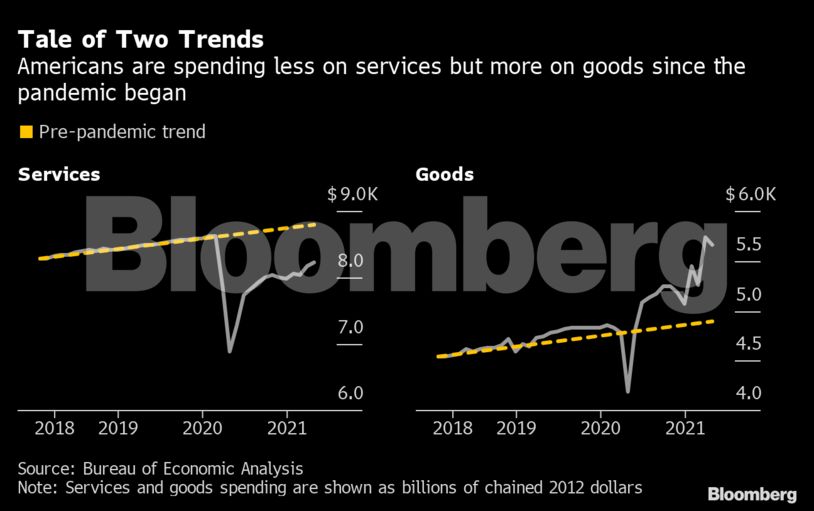 Η οικονομία των ΗΠΑ αποτελεί και το καλύτερο παράδειγμα. Ο συνολικός καταναλωτισμός παραμένει χαμηλότερος από το 2018-2019 αλλά υπάρχει τεράστια διαφορά μεταξύ των εξόδων προς υπηρεσίες και προς αγαθά. Σύμφωνα με το Peterson Institute for International Economics τα νοικοκυριά ξοδεύουν 11% περισσότερο σε αγαθά και 7% λιγότερα από τα προ-πανδημίας επίπεδα σε υπηρεσίες.