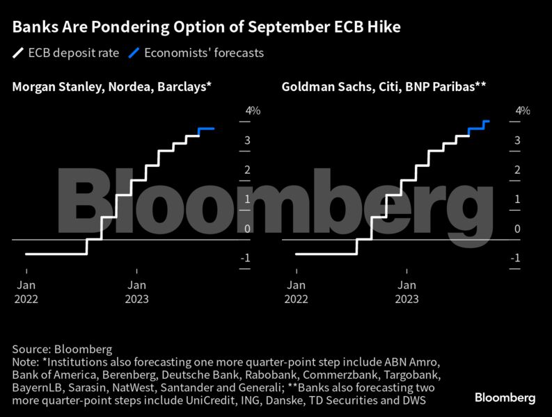 Σύμφωνα με το Bloomberg, ενώ οι αναλυτές ανέμεναν ότι η άνευ προηγουμένου εκστρατεία σύσφιγξης της ΕΚΤ θα τελείωνε μετά την αύξηση του Ιουλίου, οι αγορές πλέον θεωρούν σχεδόν δεδομένη άλλη μία αύξηση μετά από αυτή, με ώθηση από μια ήπια ανοδική αναθεώρηση των τριμηνιαίων προβλέψεων για τον πληθωρισμό.