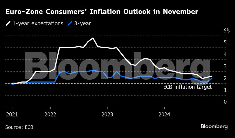 Οι πληθωριστικές προσδοκίες των καταναλωτών στη ζώνη του ευρώ αυξήθηκαν τον Νοέμβριο, ανακοίνωσε η Ευρωπαϊκή Κεντρική Τράπεζα. Οι τιμές θεωρούνταν ότι θα αυξηθούν κατά 2,6% τους επόμενους 12 μήνες, από 2,5% τον Οκτώβριο, σύμφωνα με τη μηνιαία έρευνα της στα νοικοκυριά που δημοσιεύθηκε στη Φρανκφούρτη σήμερα Τρίτη. Ο δείκτης για τα επόμενα τρία χρόνια ανέβηκε επίσης, φθάνοντας το 2,4% – αισθητά υψηλότερα από τον στόχο της ΕΚΤ για 2%.