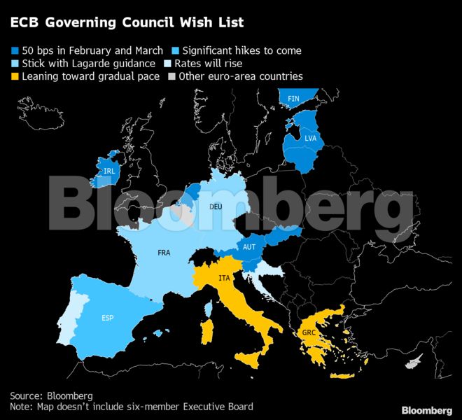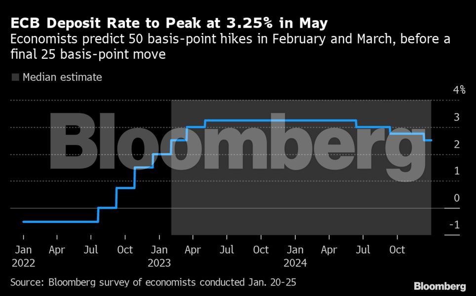 «Ο πληθωρισμός θα είναι χαμηλότερος φέτος και μια σημαντική ύφεση της οικονομίας τον χειμώνα είναι πλέον πιθανό να αποφευχθεί. Αυτό που θα μάθουμε από τη συνάντηση πολιτικής του Φεβρουαρίου είναι πώς το Διοικητικό Συμβούλιο σκοπεύει να ανταποκριθεί σε αυτό το μείγμα ειδήσεων», σημειώνουν οι Τζέιμι Ρας και Μαέβα Κούζιν . Οι οικονομολόγοι που συμμετείχαν σε δημοσκόπηση του Bloomberg βλέπουν άλλη μια αύξηση 50 μονάδων βάση τον επόμενο μήνα, πριν από μια την τελευταία αύξηση κατά 25 μονάδες βάσης Μάιο, με το επιτόκιο καταθέσεων να διαμορφώνεται στο 3,25%. Οι επενδυτές τιμολογούν το λεγόμενο τερματικό επιτόκιο στο 3,5%.