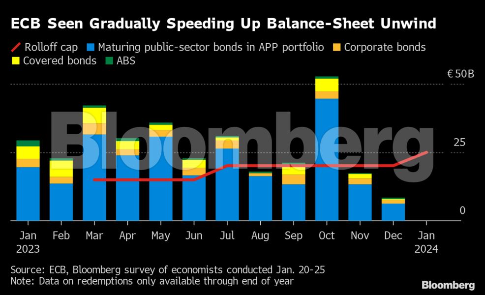Τον Δεκέμβριο, η ΕΚΤ αποφάσισε να αρχίσει σταδιακά τη μείωση του χαρτοφυλακίου ομολόγων των περίπου 5 τρισεκατομμυρίων ευρώ τα οποία αγόρασε κατά τη διάρκεια της προηγούμενης δεκαετίας. Οι επανεπενδύσεις θα περιοριστούν, ώστε το εν λόγω χαρτοφυλάκιο να συρρικνωθεί κατά 15 δισεκατομμύρια ευρώ το μήνα από τον Μάρτιο έως τα τέλη Ιουνίου.