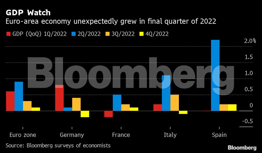 Η ευρωζώνη, η οποία από τον προηγούμενο μήνα περιλαμβάνει 20 μέλη, μετά την ένταξη της Κροατίας, έδειξε σημάδια ανθεκτικότητας εν μέσω της ενεργειακής κρίσης που προκλήθηκε από την εισβολή της Ρωσίας στην Ουκρανία. Εκτός από την πιθανή αποφυγή μιας ήπιας ύφεσης, οικοδομείται εμπιστοσύνη για τους επόμενους μήνες, γεγονός που θα μπορούσε να ενισχύσει της φωνές που θέλουν πιο δραστικά μέτρα για την αντιμετώπιση του πληθωρισμού από την ΕΚΤ.