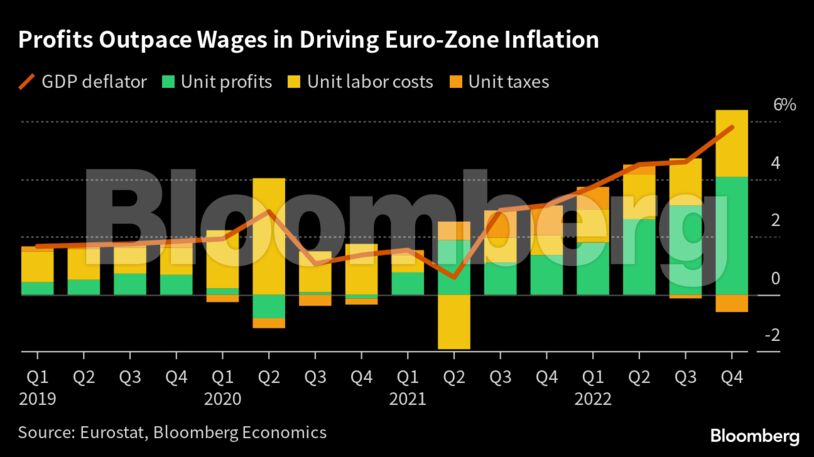 Σύμφωνα με την αναλυτή του Bloomberg Economics, Μαέβα Κάζιν, τα εταιρικά κέρδη αποτελούν σημαντικότερο παράγοντα όσον αφορά την αύξηση των τιμών σε σχέση με το κόστος εργασίας από το 2021. Η αναλυτής υπολογίζει πως τα 2/3 των περσινών πληθωριστικών πιέσεων οφείλονταν στην αύξηση των εταιρικών κερδών μέχρι το τέλος του 2022.