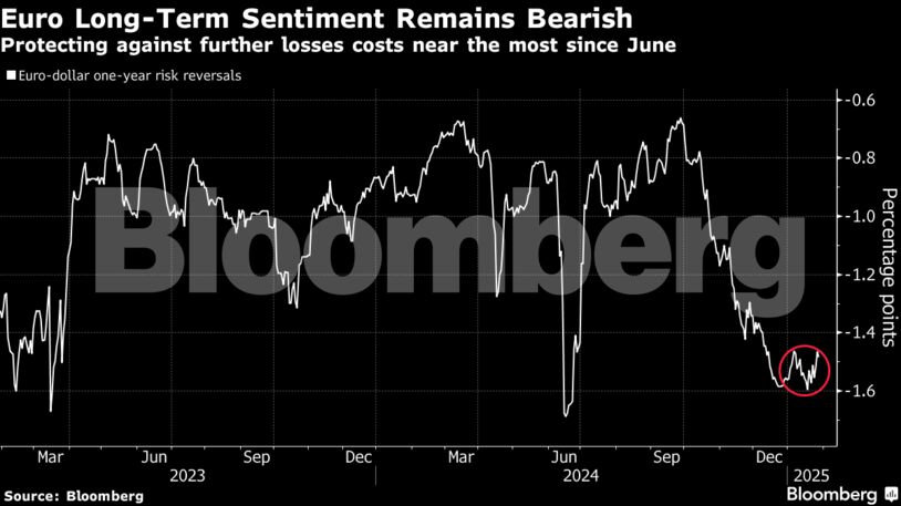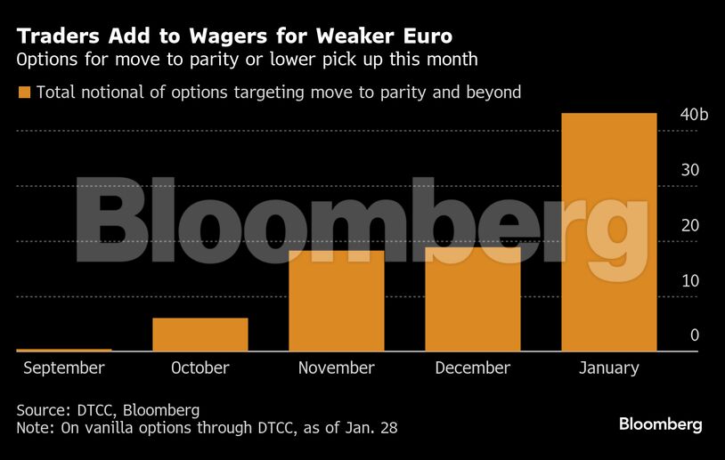 Το κόστος της αντιστάθμισης έναντι ενός ασθενέστερου ευρώ μέχρι το τέλος του έτους είναι κοντά στο υψηλότερο από τον Ιούνιο, όπως δείχνουν τα στοιχεία της αγοράς. Η ζήτηση για δικαιώματα προαίρεσης που έχουν καλές αποδόσεις σε περίπτωση που το νόμισμα εξασθενήσει τουλάχιστον στην απόλυτη ισοτιμία φέτος έχει υπερδιπλασιαστεί αυτόν τον μήνα σε σύγκριση με τον Νοέμβριο και τον Δεκέμβριο, σύμφωνα με τα στοιχεία της Depository Trust & Clearing Corporation.
