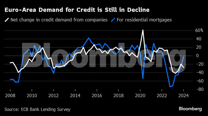 «Τα υψηλότερα επιτόκια, καθώς και οι χαμηλότερες επενδύσεις πάγιου κεφαλαίου για τις επιχειρήσεις και η χαμηλότερη καταναλωτική εμπιστοσύνη για τα νοικοκυριά, άσκησαν μειωτικές πιέσεις στη ζήτηση δανείων», ανέφερε η ΕΚΤ. «Η σημαντική μείωση της ζήτησης δανείων από τις επιχειρήσεις ήρθε σε αντίθεση με τις προηγούμενες προσδοκίες των τραπεζών για σταθεροποίηση».