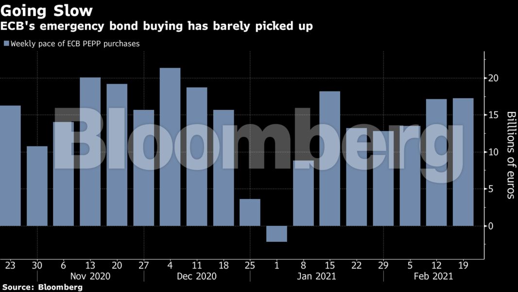 Ωστόσο, αν το ποσό των αγορών δεν έχει αυξηθεί σημαντικά, οι επενδυτές μπορεί να πεισθούν να συνεχίσουν τα λεγόμενα reflation trades, δηλαδή τα στοιχήματα ότι η ΕΚΤ θα ανεχθεί υψηλότερο κόστος δανεισμού από τις κυβερνήσεις καθώς η οικονομία αρχίζει να ανακάμπτει.