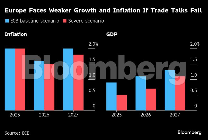 Η αβεβαιότητα επιτείνεται από την απειλή του Τραμπ να επιβάλει δασμούς 30% στις ευρωπαϊκές εισαγωγές από 1η Αυγούστου. Οι διαπραγματεύσεις συνεχίζονται, αλλά η πιθανότητα αρνητικής εξέλιξης έχει αυξηθεί. Ακόμη και το απαισιόδοξο σενάριο της ΕΚΤ για το εμπόριο προέβλεπε δασμούς μόλις 20%.