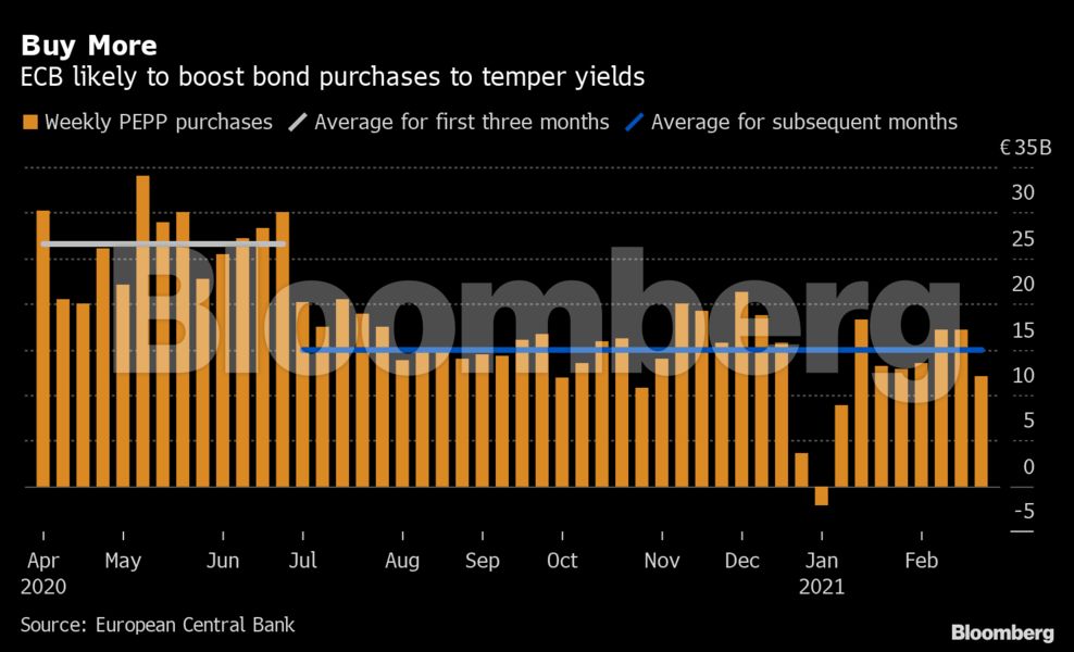 Αφού επέκτεινε το πρόγραμμα έκτακτης ανάγκης για πανδημία σε 1,85 τρισεκατομμύρια ευρώ (2,2 τρισεκατομμύρια δολάρια) τον Δεκέμβριο, η Ευρωπαϊκή Κεντρική Τράπεζα έχει αρκετό χώρο για να αυξήσει τις αγορές ομολόγων προκειμένου να περιορίσει τις ανοδικές πιέσεις στις αποδόσεις. Η ενίσχυση των αγορών της τώρα θα έδινε ένα ισχυρό σήμα αντίδρασης.