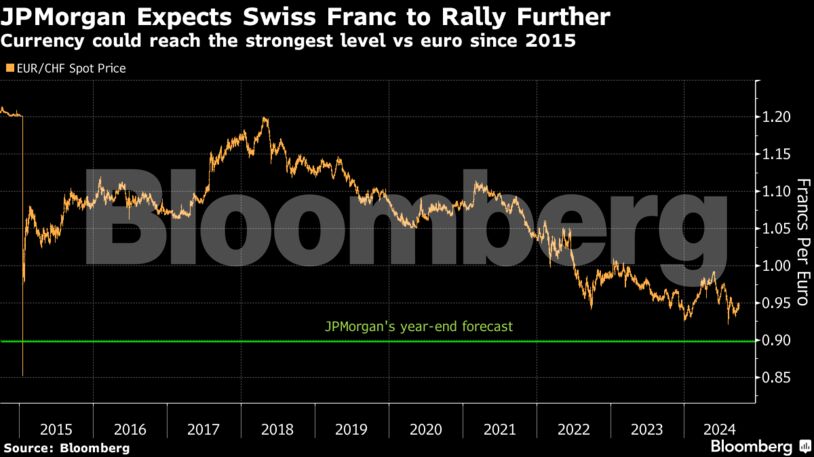 Το ελβετικό φράγκο ενδέχεται να φθάσει στο ισχυρότερο επίπεδο εδώ και σχεδόν μια δεκαετία, καθώς η κεντρική τράπεζα της χώρας μειώνει τα επιτόκια σταδιακά σε σχέση με τις ομοειδείς της και απέχει από παρεμβάσεις για την αποδυνάμωση του νομίσματος, σύμφωνα με τις JPMorgan Chase & Co. και Bank of New York Mellon.