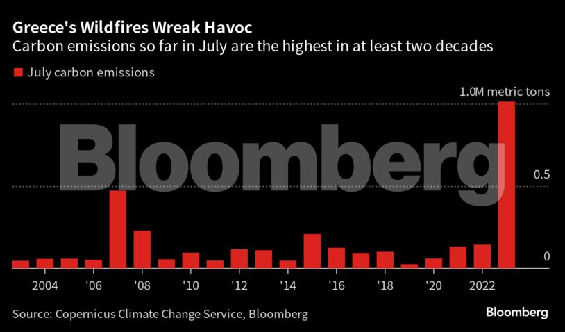Στην Ελλάδα πάνω από 100 πυρκαγιές σε δασικές εκτάσεις στη χώρα έχουν ήδη εκπέμψει πάνω από 1 εκατομμύρια τόνους άνθρακα στην ατμόσφαιρα, ρεκόρ υψηλό εδώ και τουλάχιστον δύο δεκαετίες, σύμφωνα με το Copernicus Climate Change Service.