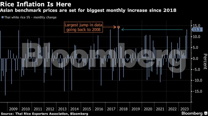 Ο συνδυασμός της πρόσφατης απόφασης της ινδικής κυβέρνησης να επιβάλει εμπάργκο στην εξαγωγή ρυζιού και του φαινομένου Ελ Νίνιο, έχει αυξήσει τις τιμές των σιτηρών σε νέα υψηλά. Το ταϊλανδέζικο ρύζι κατέγραψε αύξηση στα $648/τόνο την περασμένη εβδομάδα, φέρνοντας και πάλι το «φάντασμα» της επισιτιστικής κρίσης στην Ασία και την Αφρική στο προσκήνιο.