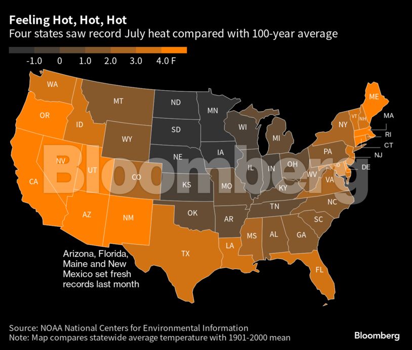 Στις ΗΠΑ, τέσσερις πολιτείες, δη η Αριζόνα, η Φλόριντα, το Μέιν και το Νέο Μεξικό κατέγραψαν νέα υψηλά ρεκόρ θερμοκρασίας, σύμφωνα με την NOAA.