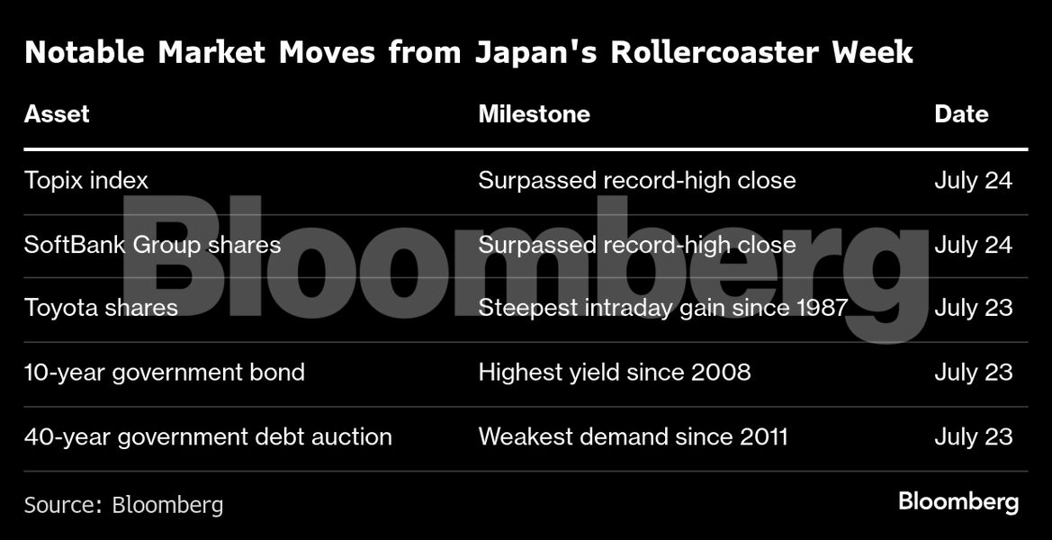 Ο δείκτης Topix σημείωσε εβδομαδιαία άνοδο 4%, ενώ οι μετοχές Toyota είχαν τη μεγαλύτερη ημερήσια άνοδο από το 1987 και οι μετοχές SoftBank άγγιξαν ιστορικό υψηλό. Οι αποδόσεις των 10ετών ιαπωνικών ομολόγων έφτασαν στο υψηλότερο σημείο από το 2008.