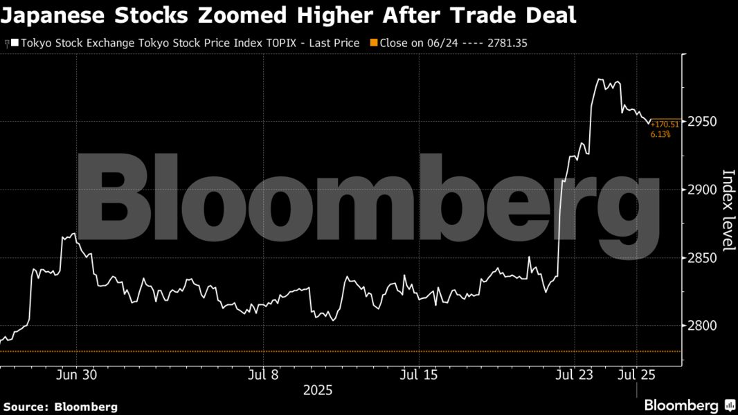 Οι μετοχές αυτοκινητοβιομηχανιών ηγήθηκαν της ανόδου, με τον δείκτη Topix να καταγράφει ρεκόρ κλεισίματος. Οι αγορές αγνόησαν τις λεπτομέρειες της συμφωνίας και τη εύθραυστη πολιτική θέση του Πρωθυπουργού Shigeru Ishiba μετά από εκλογική ήττα.
