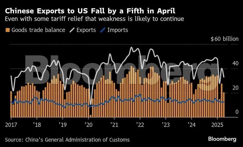 Σύμφωνα με το Bloomberg Economics, η μέση δασμολογική επιβάρυνση των ΗΠΑ προς την Κίνα μειώθηκε από πάνω από 100 ποσοστιαίες μονάδες στις 28, διαμορφώνοντας τους δασμούς κάτω από το 40%. Σε σύγκριση, η επιβάρυνση για τις εισαγωγές από τον υπόλοιπο κόσμο παραμένει στο 8%.