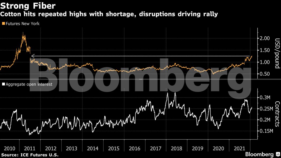 Οι προθεσμιακές τιμές του βαμβακιού αυξήθηκαν σε νέο υψηλό επίπεδο 10ετίας, εν μέσω παγκόσμιας έλλειψης ελάστρων για τη συμπίεση νημάτων.