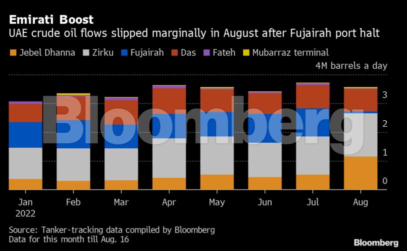 Σημειωτέον πως οι εξαγωγές πετρελαίου κατέγραψαν σχετική μείωση τον Αύγουστο λόγω της εκτροπής των εξαγωγών πετρελαίου Murban από το Abu Dhabi στις μονάδες Jebel Dhana στον Περσικό Κόλπο. Οι εξαγωγές των ΗΑΕ άγγιξαν τα 3,57 εκατ. βαρέλια/ημέρα τις πρώτες 16 ημέρες του Αυγούστου, σύμφωνα με στοιχεία του Bloomberg, σχετικά μειωμένες από τα 3,72 εκατ. βαρέλια/ημέρα του Ιουλίου.