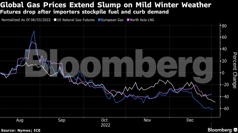 «Ο κίνδυνος ακραίας στενότητας της αγοράς για τον οποίο οι άνθρωποι ανησυχούσαν πριν ξεκινήσει ο χειμώνας φαίνεται χαμηλός τώρα», δήλωσε ο Abhishek Rohatgi, αναλυτής του BloombergNEF από τη Σιγκαπούρη. Η Ευρώπη έχει ξαναχτίσει τα αποθέματα, ενώ ο ήπιος καιρός σε ολόκληρη τη Βόρεια Ασία σημαίνει ότι θα υπάρχει λιγότερος ανταγωνισμός για φορτία υγροποιημένου φυσικού αερίου, όπως είπε.