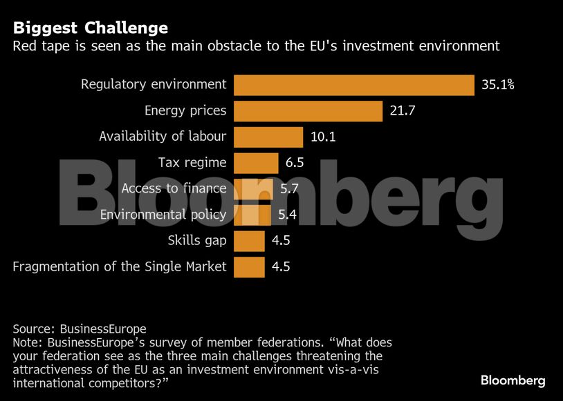 Η δημοσίευση της έκθεσης έγινε μία ημέρα πριν από τη σύνοδο κορυφής των ηγετών της ΕΕ στις Βρυξέλλες, όπου η χαμηλή ανταγωνιστικότητα του μπλοκ θα είναι βασικό θέμα συζήτησης. Σύμφωνα με την BusinessEurope, οι επιχειρήσεις θεωρούν τη ρυθμιστική επιβάρυνση ως τη μεγαλύτερη πρόκληση που αντιμετωπίζουν, ξεπερνώντας ακόμη και το κόστος της ενέργειας, σύμφωνα με το Bloomberg.