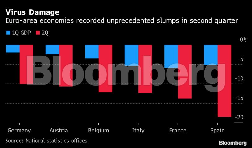 Ενώ το ΑΕΠ ευρωζώνης συρρικνώθηκε σε ποσοστό – ρεκόρ της τάξης 12,1% στο β’ τρίμηνο, στέλνοντας την παραγωγή πίσω στα επίπεδα του 2005, η οικονομία ανέκαμψε γρηγορότερα του αναμενόμενου τον Μάιο και τον Ιούνιο, με την άρση των lockdowns. Η ΕΚΤ είχε κάνει πρόβλεψη για πτώση του ΑΕΠ κατά 13%.