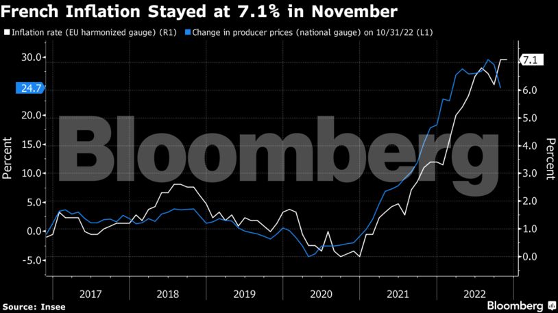 Οι τιμές καταναλωτή στη δεύτερη μεγαλύτερη οικονομία της ευρωζώνης ενισχύθηκαν κατά 7,1% εν συγκρίσει με έναν χρόνο πριν, συνεχίζοντας την αύξηση που σημειώθηκε τον Οκτώβριο, σύμφωνα με τη στατιστική υπηρεσία της χώρας Insee. Οι αναλυτές που έλαβαν μέρος σε έρευνα του Bloomberg είχαν υπολογίσει αύξηση 7%.