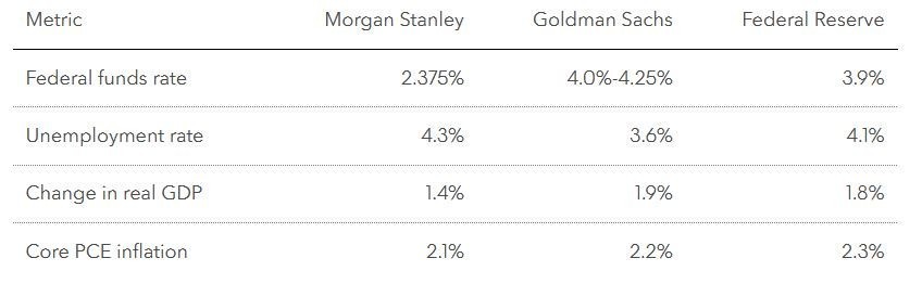 Ακολουθούν ορισμένες από τις προβλέψεις της Morgan Stanley και της Goldman Sachs για το 2025, σε σύγκριση με τον μέσο όρο των προβλέψεων των αξιωματούχων της Fed τον Σεπτέμβριο: