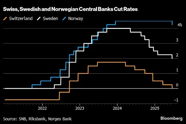 Η Κεντρική Τράπεζα της Ελβετίας και η Riksbank της Σουηδίας, οι οποίες μόλις τον Μάρτιο είχαν αφήσει να εννοηθεί ότι πιθανότατα ολοκληρώνουν τον κύκλο χαλάρωσης, τελικά προχώρησαν σε νέες μειώσεις κατά 25 μονάδες βάσης, την Πέμπτη και την Τετάρτη αντιστοίχως.