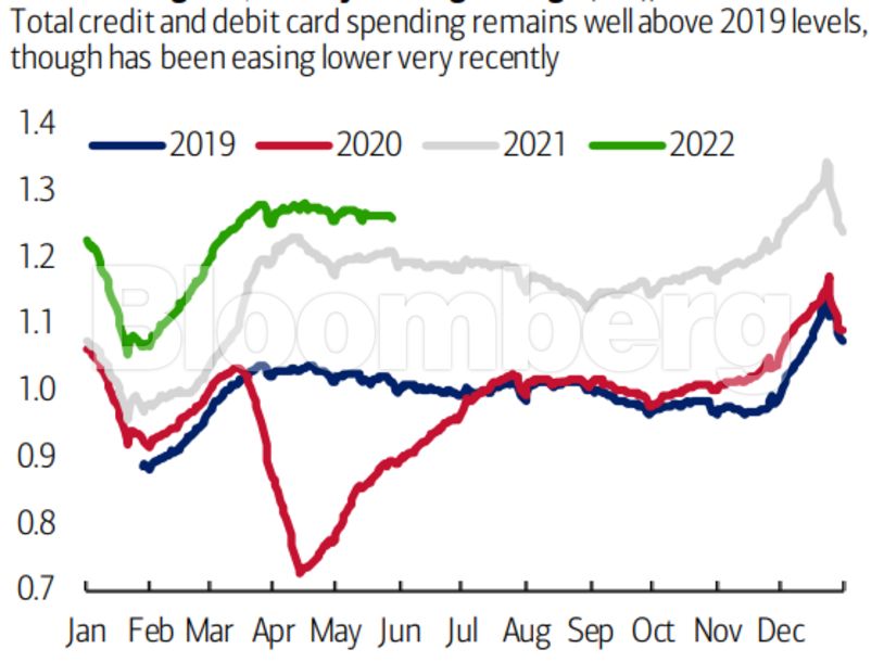 Τα καταναλωτικά έξοδα των αμερικανικών νοικοκυριών συνεχίζονται σε υγιές επίπεδο, ιδιαίτερα σε ό,τι αφορά τον τομέα υπηρεσιών όπως τα ταξίδια και τη διασκέδαση, σύμφωνα με στοιχεία της BofA. O μέσος όρος κατανάλωσης μέσω χρεωστικών και πιστωτικών καρτών αυξήθηκε κατά 9% σε ετήσιο επίπεδο τον περασμένο Μάιο.