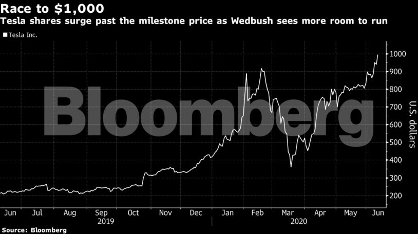 Η μετοχή της Tesla για πρώτη φορά στην ιστορία της πέρασε για την ώρα τα 1000 δολάρια σημειώνοντας ράλι κοντά στο 6% και διεκδικώντας ένα νέο ιστορικό υψηλό κλείσιμο, καθώς αυξάνεται η ζήτηση του Model 3 στην Κίνα. Η κίνηση της μετοχής οδήγησε τους αναλυτές της Wedbush να αναδείξουν την «τεράστια» ευκαιρία αγοράς μετοχών αλλά και τις προσπάθειες καινοτομίας της εταιρείας.