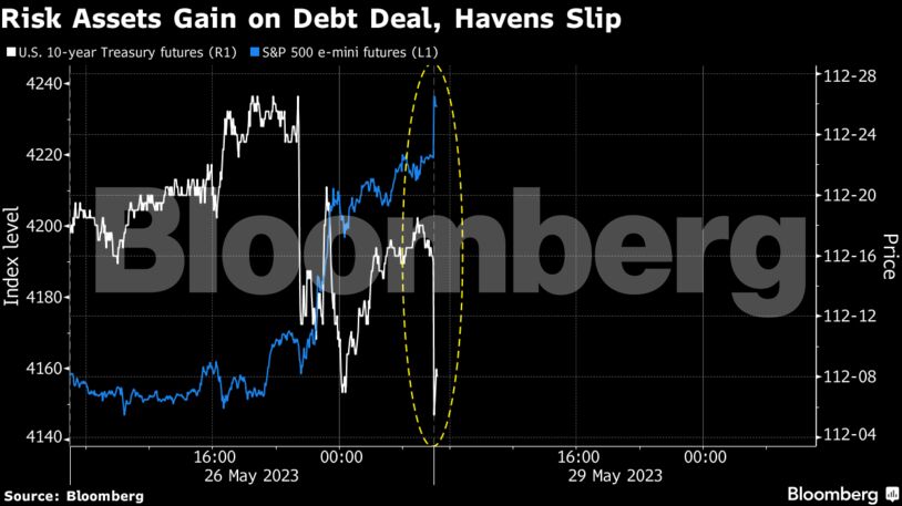 Έτοιμες για ράλι φαίνονται οι αγορές μετά από την αρχική συμφωνία για το αμερικανικό χρέος. Σύμφωνα με το Bloomberg, οι επενδυτές είχαν στραφεί στα ασφαλή επενδυτικά καταφύγια τις περασμένες εβδομάδες λόγω της αβεβαιότητας όσον αφορά την επίτευξη ή μή της συμφωνίας για το αμερικανικό χρέος. Ο Πρόεδρος των ΗΠΑ, Τζο Μπάιντεν, και ο Πρόεδρος της Βουλής των Αντιπροσώπων, Κέβιν Μακάρθι, δήλωσαν σίγουροι πως η αρχική συμφωνία την οποία σύναψαν όσον αφορά το χρέος θα περάσει από το Κογκρέσο, αποφεύγοντας μία ιστορική στάση πληρωμών των ΗΠΑ.