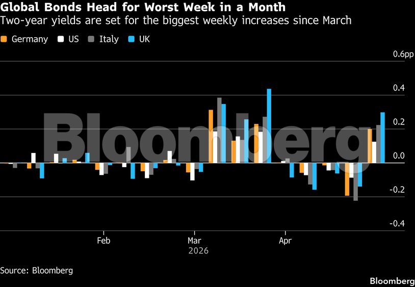 Οι αποδόσεις αυξήθηκαν στις κύριες αγορές αυτή την εβδομάδα, με τα διετή ομόλογα των ΗΠΑ, της Γερμανίας και του Ηνωμένου Βασιλείου να οδεύουν προς τις μεγαλύτερες εβδομαδιαίες αυξήσεις του μήνα. Η απόδοση του αμερικανικού διετούς έχει αυξηθεί κατά 12 μονάδες βάσης από τη Δευτέρα στο 3,83%, ενώ η απόδοση του αντίστοιχου βρετανικού ομολόγου έχει ενισχυθεί κατά 30 μονάδες βάσης, φτάνοντας στο 4,42%.