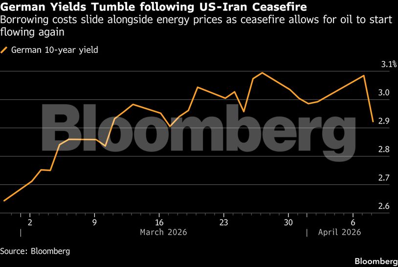 Οι αποδόσεις των γερμανικών (Bunds) και των βρετανικών (Gilts) 10ετών ομολόγων υποχώρησαν σε χαμηλό τριών εβδομάδων, μετά τη συμφωνία για 14ήμερη ανακωχή και τη δέσμευση της Τεχεράνης να επιτρέψει την ελεύθερη διέλευση πλοίων από τα Στενά του Ορμούζ.