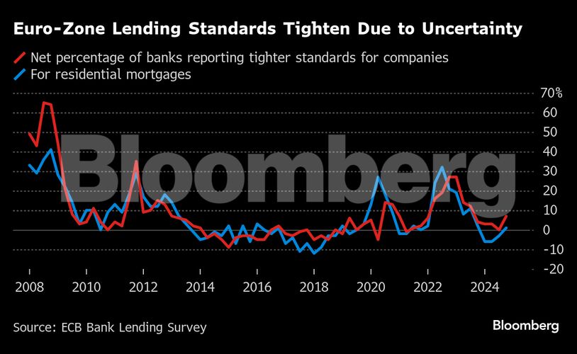 Οι ευρωπαϊκές τράπεζες αυστηροποιούν τα πρότυπα πιστωτικών δανείων για τις εταιρείες περισσότερο από οποιαδήποτε άλλη φορά από το 2023, σύμφωνα με την Ευρωπαϊκή Κεντρική Τράπεζα — καταρρίπτοντας τις ελπίδες για γρήγορη ανάκαμψη στη χρηματοδότηση των επιχειρήσεων που θα μπορούσε να στηρίξει τις επενδύσεις.