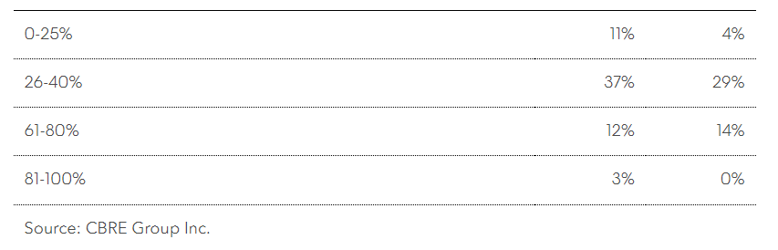 Σχεδόν τα 2/3 των μεγαλύτερων εταιρειών -εκείνες με 5.000 εργαζόμενους ή περισσότερους- έχουν ποσοστά χρήσης άνω του 40% στην Ευρώπη, σύμφωνα με την έρευνα. Πριν από την πανδημία, τα γραφεία παγκοσμίως κατέγραφαν μέσο όρο προσέλευσης 65%, σύμφωνα με τα στοιχεία της CBRE.