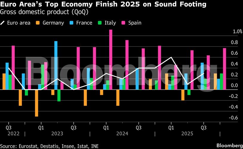 Το γερμανικό ΑΕΠ αυξήθηκε κατά 0,3% το τέταρτο τρίμηνο, καταγράφοντας την πρώτη άνοδο από τις αρχές του 2025 και ξεπερνώντας την αρχική εκτίμηση. Η Ισπανία ξεχώρισε για ακόμη μία φορά, με ανάπτυξη 0,8%, υψηλότερη των προσδοκιών, ενώ η Γαλλία και η Ιταλία κατέγραψαν αύξηση της οικονομικής δραστηριότητας κατά 0,2% και 0,3% αντίστοιχα.