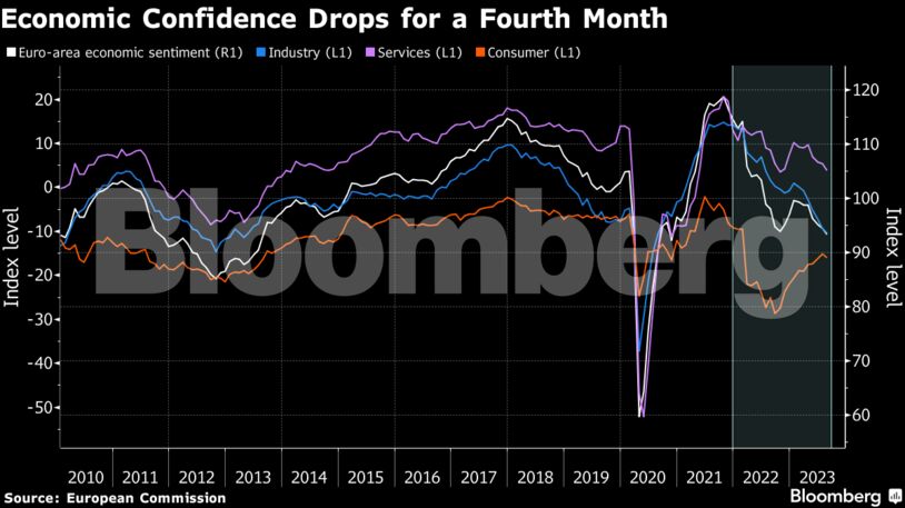 Ο δείκτης οικονομικού κλίματος που δημοσιεύει η Ευρωπαϊκή Επιτροπή διολίσθησε στο 93,3 από 94,5 τον Ιούλιο. Αυτή είναι η τέταρτη μηνιαία πτώση και χειρότερη από τη μέση πρόβλεψη σε έρευνα του Bloomberg μεταξύ οικονομολόγων.
