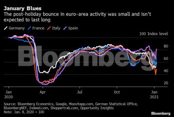 Οι δείκτες υψηλής συχνότητας δείχνουν ότι ενώ η οικονομική δραστηριότητα της Ζώνης του Ευρώ σημείωσε άνοδο την πρώτη εβδομάδα του τρέχοντος έτους, καθώς οι άνθρωποι επέστρεψαν στην εργασία τους, η βελτίωση αυτή είναι πολύ χαμηλότερη σε σχέση με το 2020.