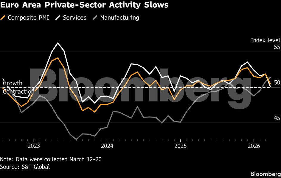Ο ανώτερος οικονομολόγος της Bloomberg Economics για την ευρωζώνη, Ντέιβιντ Πάουελ, σημείωσε ότι η έρευνα PMI αποκαλύπτει «σημαντική επιβράδυνση της οικονομίας της νομισματικής ένωσης καθώς ο πόλεμος στη Μέση Ανατολή επιβαρύνει τη δραστηριότητα».