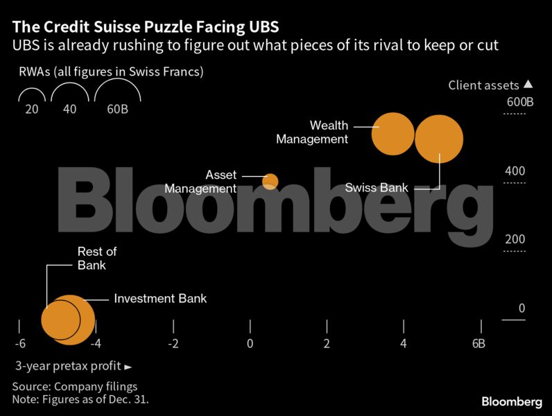 Στις 15 Μαρτίου, όταν η Credit Suisse έλαβε μια σανίδα σωτηρίας από την ελβετική κεντρική τράπεζα, η αντίπαλός της γρήγορα πέρασε από τα σχέδια στην εκτέλεση. Η UBS κάλεσε τους συμβούλους της Morgan Stanley και τους τραπεζίτες της JPMorgan Chase & Co., ορισμένοι από τους οποίους πέταξαν στη Ζυρίχη και υπέγραψαν συμφωνίες εμπιστευτικότητας.