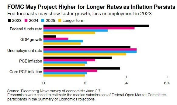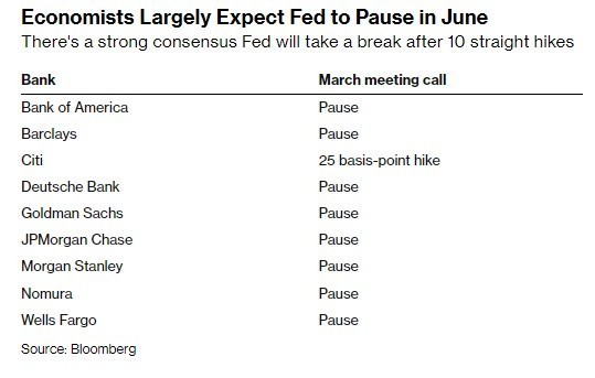 Σύμφωνα με τους αναλυτές του Bloomberg Economics, Άννα Γουόνγκ, Στούαρτ Πολ, Ελάιζα Γουίνγκερ και Τζόναθαν Τσερτς, «το πιθανότερο είναι πως η Fed θα προχωρήσει σε παύση της αύξησης των επιτοκίων τον Ιούνιο, αφήνοντας ανοιχτό το ενδεχόμενο περαιτέρω αύξησης τον Ιούλιο».