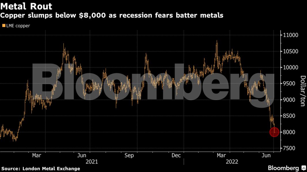 Στον βαθμό που ο χαλκός αποτελεί βαρόμετρο για την παγκόσμια οικονομία, η ανησυχία στις αγορές εμπορευμάτων γίνεται ακόμα πιο έντονη. Το μέταλλο που χρησιμοποιείται στις ηλεκτρικές καλωδιώσεις μόλις έπεσε κάτω από τα 8.000 δολάρια ο τόνος για πρώτη φορά από τις αρχές του 2021. Επιπλέον, οι ηχηρές προειδοποιήσεις για ύφεση στην παγκόσμια οικονομία ρίχνει βαριά σκιά στην αγορά των εμπορευμάτων την ώρα που μουδιασμένη ανάκαμψη της Κίνας δεν αφήνει και πολλά περιθώρια αισιοδοξίας στους επενδυτές.