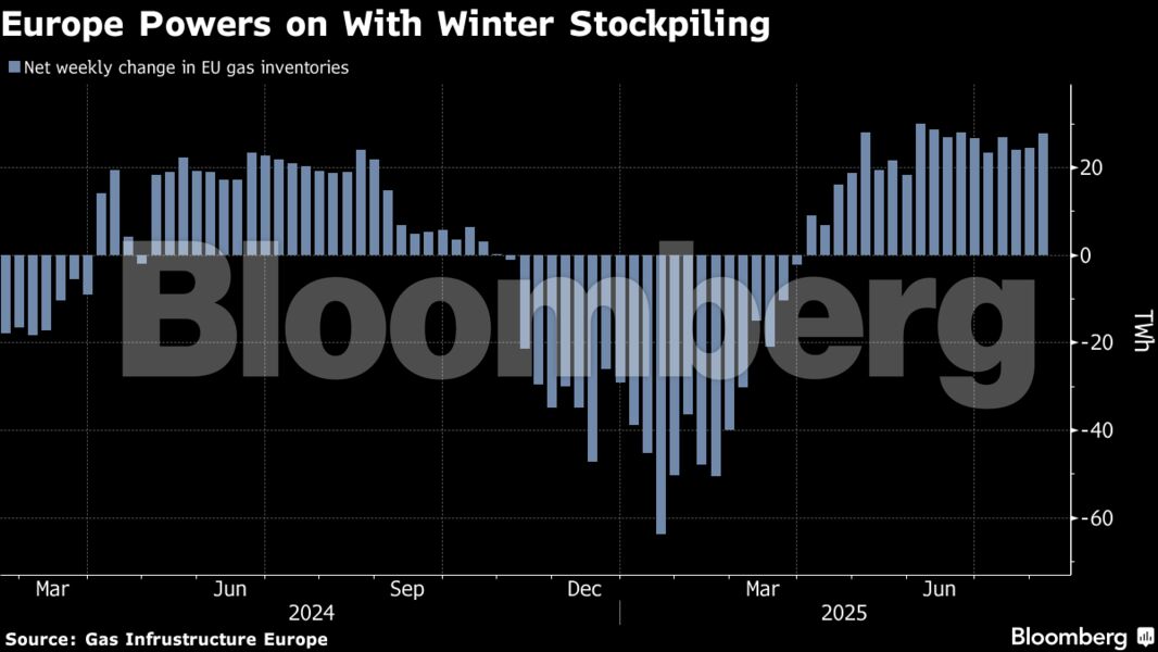 Η Ευρώπη καταβάλλει προσπάθειες να διασφαλίσει επαρκή αποθέματα, με τα νεότερα στοιχεία της Gas Infrastructure Europe να δείχνουν τη μεγαλύτερη εβδομαδιαία άνοδο από τον Ιούνιο. Η αύξηση αυτή συμβάλλει στην αποτροπή ανόδου τιμών, παρότι ο Πρόεδρος των ΗΠΑ Ντόναλντ Τραμπ εντείνει τις πιέσεις προς την Ινδία με απειλές κυρώσεων για αγορές ρωσικού πετρελαίου, εν όψει της κρίσιμης προθεσμίας της 8ης Αυγούστου για επίτευξη εκεχειρίας με την Ουκρανία.