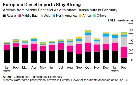 Μεγάλες ποσότητες ντίζελ έχει εισάγει η Ευρώπη μέσα στον Φεβρουάριο, με το κενό από τις ρωσικές παραδόσεις να καλύπτεται επαρκώς από τα φορτία της Μέσης Ανατολής και της Ασίας.