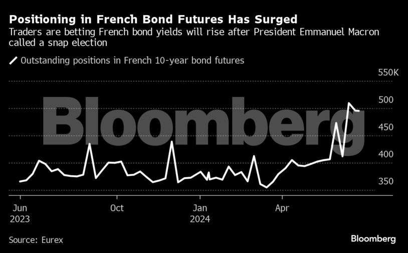 Οι έμποροι πηγαίνουν στις βουλευτικές εκλογές του Σαββατοκύριακου κρατώντας τα περισσότερα συμβόλαια μελλοντικής εκπλήρωσης σε γαλλικά ομόλογα εδώ και τουλάχιστον ένα χρόνο, ένα σημάδι ότι στοιχηματίζουν ότι οι αποδόσεις θα πάνε υψηλότερα. Οι επενδυτές που επιλέγουν μετοχές αντισταθμίζουν τις απώλειες με τα περισσότερα δικαιώματα προαίρεσης πώλησης που συνδέονται με τον κύριο δείκτη αναφοράς των blue-chip της Ευρώπης εδώ και δύο χρόνια. Και οι έμποροι συναλλάγματος επενδύουν σε παράγωγα που τους προστατεύουν από την πτώση του ευρώ με τον ταχύτερο ρυθμό των τελευταίων 15 μηνών.