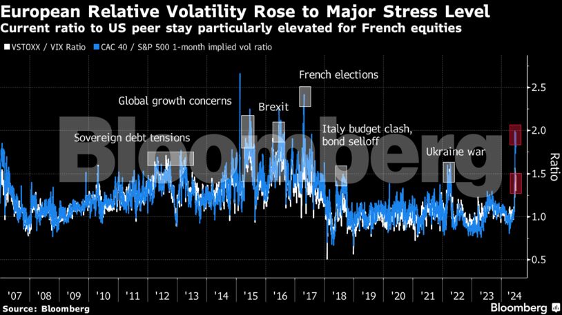 Την Κυριακή 30/6, οι επενδυτές θα διαπιστώσουν αν το ξεπούλημα έχει περιθώριο να συνεχιστεί. Το διακύβευμα είναι υψηλό. Η δημοσιονομική εντιμότητα της Γαλλίας είναι υπό αμφισβήτηση με τους επενδυτές να σορτάρουν τα ομόλογα της χώρας ακόμη και πριν από την αιφνιδιαστική απόφαση του Μακρόν, και η γοητεία της περιοχής ως σταθερή και σχετικά απαλλαγμένη από τη μεταβλητότητα εναλλακτική λύση στις αμερικανικές αγορές έχει δεχθεί πλήγμα, όπως γράφει το Bloomberg.