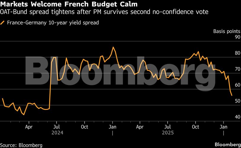 Το περιθώριο απόδοσης του γαλλικού 10ετούς ομολόγου έναντι των γερμανικών bunds έχει περιοριστεί στο χαμηλότερο επίπεδο από τον Ιούνιο του 2024, όταν ο πρόεδρος Εμανουέλ Μακρόν προκήρυξε πρόωρες εκλογές, ανοίγοντας μια παρατεταμένη περίοδο πολιτικής αστάθειας. Ωστόσο, η Γαλλία εξακολουθεί να απέχει σημαντικά από τον στόχο της Ευρωπαϊκής Ένωσης για έλλειμμα 3% του ΑΕΠ έως το 2029.