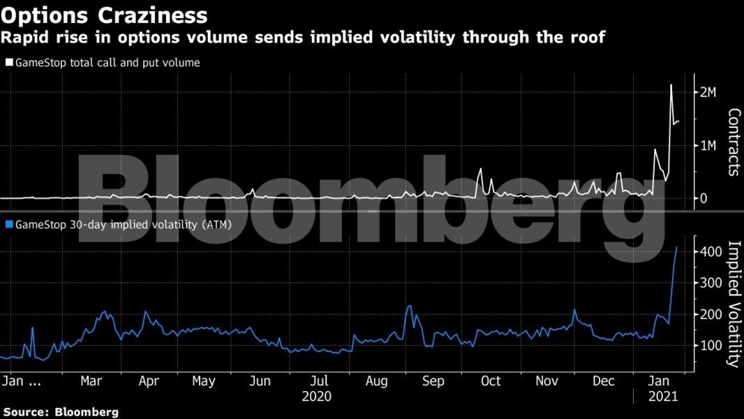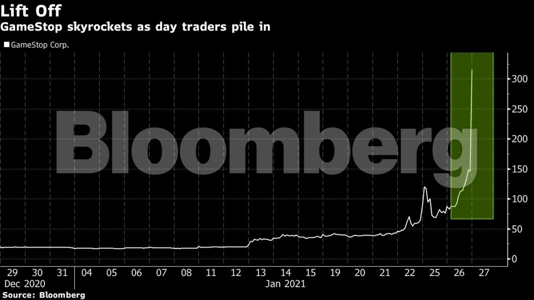 Η μετοχή της GameStop -εταιρείας που δραστηριοποιείται στη λιανική πώληση βιντεοπαιχνιδιών- βρέθηκε στα 380 δολάρια στη σημερινή συνεδρίαση με άνοδο κατά 157% με αποτέλεσμα να υποχρεωθεί ήδη δύο φορές σε διακοπή της διαπραγμάτευσης λόγω της μεγάλης μεταβλητότητας. Το ράλι της μετοχής έχει ως αποτέλεσμα να αυξηθεί μόνο αυτό τον μήνα η χρηματιστηριακή της αξία πάνω από 20 φορές σε περίπου 26 δισ. δολάρια. Αυτά τα επίπεδα τιμών καθιστούν την GameStop μεγαλύτερη από το σχεδόν ένα τρίτο των εταιρειών του δείκτη S&P 500.