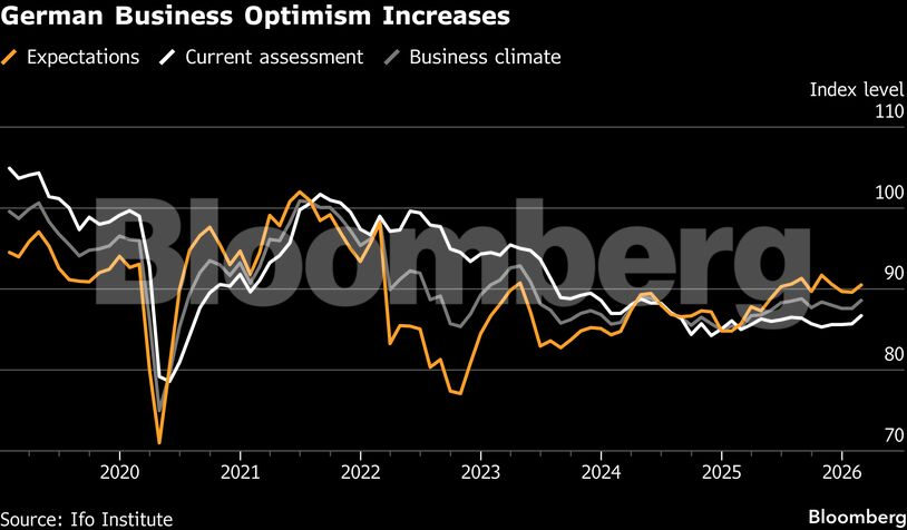 Ο δείκτης προσδοκιών του Ifo Institute αυξήθηκε στις 90,5 μονάδες από αναθεωρημένες 89,6 τον Ιανουάριο, υπερβαίνοντας τη διάμεση πρόβλεψη των 90 μονάδων σε έρευνα του Bloomberg. Παράλληλα, και ο δείκτης τρεχουσών συνθηκών βελτιώθηκε περισσότερο από όσο ανέμενε η αγορά.